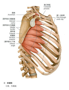 前鋸筋は、肩甲骨から肋骨に付着する筋肉です。
